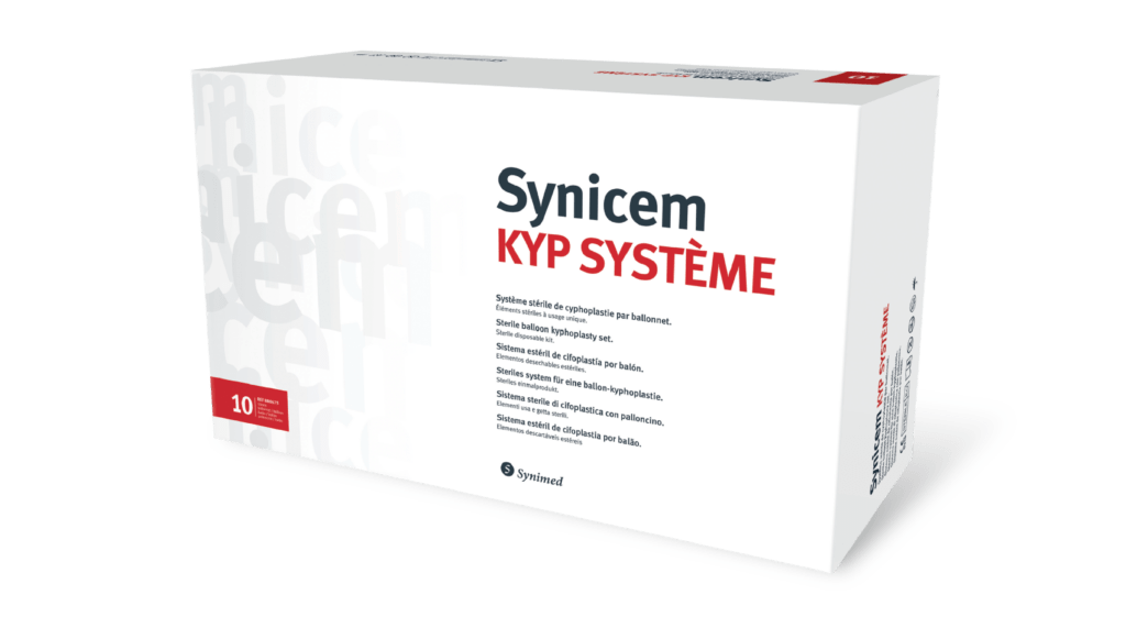 SYNICEM KYP SYSTÈME is a certified application system designed for the percutaneous treatment of vertebral bodies by a balloon kyphoplasty. It provides all the instruments required to support the procedure, enabling progressive and controlled application of the cement, with the option to purchase individual sterile instruments for interventions involving more than one vertebra in the same procedure.2