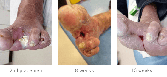 Angioplasty was performed on the left leg, resulting in successful superficial femoral artery (SFA) and anterior tibial artery (ATA) run-off. Further surgical debridement included resection of the infected 2nd metatarsal bone and 3rd toe amputation. Topical negative pressure therapy (TNP) applied initially but failed due to difficulties achieving an effective seal in the community setting.